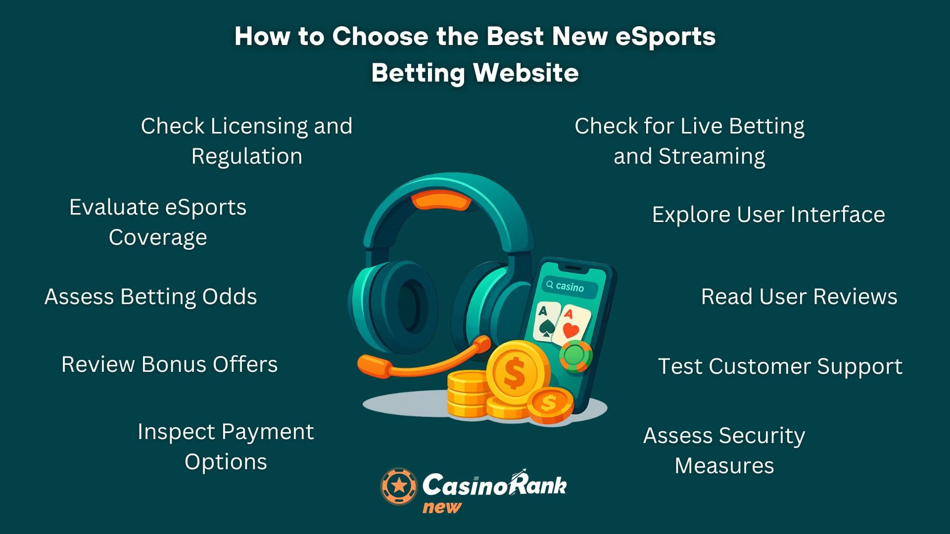 Para identificar los mejores sitios nuevos de apuestas de eSports de 2026, aplicamos una evaluación basada en datos y múltiples factores. Los criterios clave incluyen: